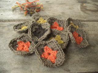 It's kind of rubbed off on me and here I am producing teeny tiny crochet squares. These are the nine small squares that will be blocked then joined together to form a larger square with the dark brown one in the centre. The best thing is that it is an easy pattern and each one can be whipped up within the time frame of a toddlers swimming lesson. If I like the look of the square I might make a few more and turn it into a rectangle.