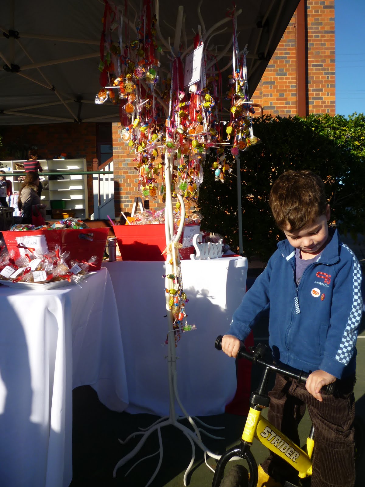 We hit another of our local school fetes today. We couldn't not go, we have mates at this one. Who need our support, and companionship on the unlimited rides. We are starting to worry though that the smalls may start to consider it normal weekend etiquette to obtain an all day ride pass to while away those gorgeous blue skied wintery days. This was the lolly necklace tree on the sweet stall. These necklaces are THE item to have and sold out in a jiffy. A few fantales and a lollipop on a ribbon and Bob's your uncle thankyou very much and even the boys are lining up for these.